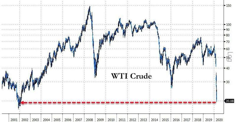 ‘Texas Miracle’ “On Ice For Time Being” As Crude-Carnage & COVID-Chaos Double-Whammy Strikes Lone-Star State West Texas Intermediate (WTI) spot prices plunged 7.5% to the 19-handle on Sunday evening, hitting lows not seen since 2002.  WTI has crashed 70% in the last 56 trading sessions amid the COVID-19 crisis triggering a demand bust across the world. As […]