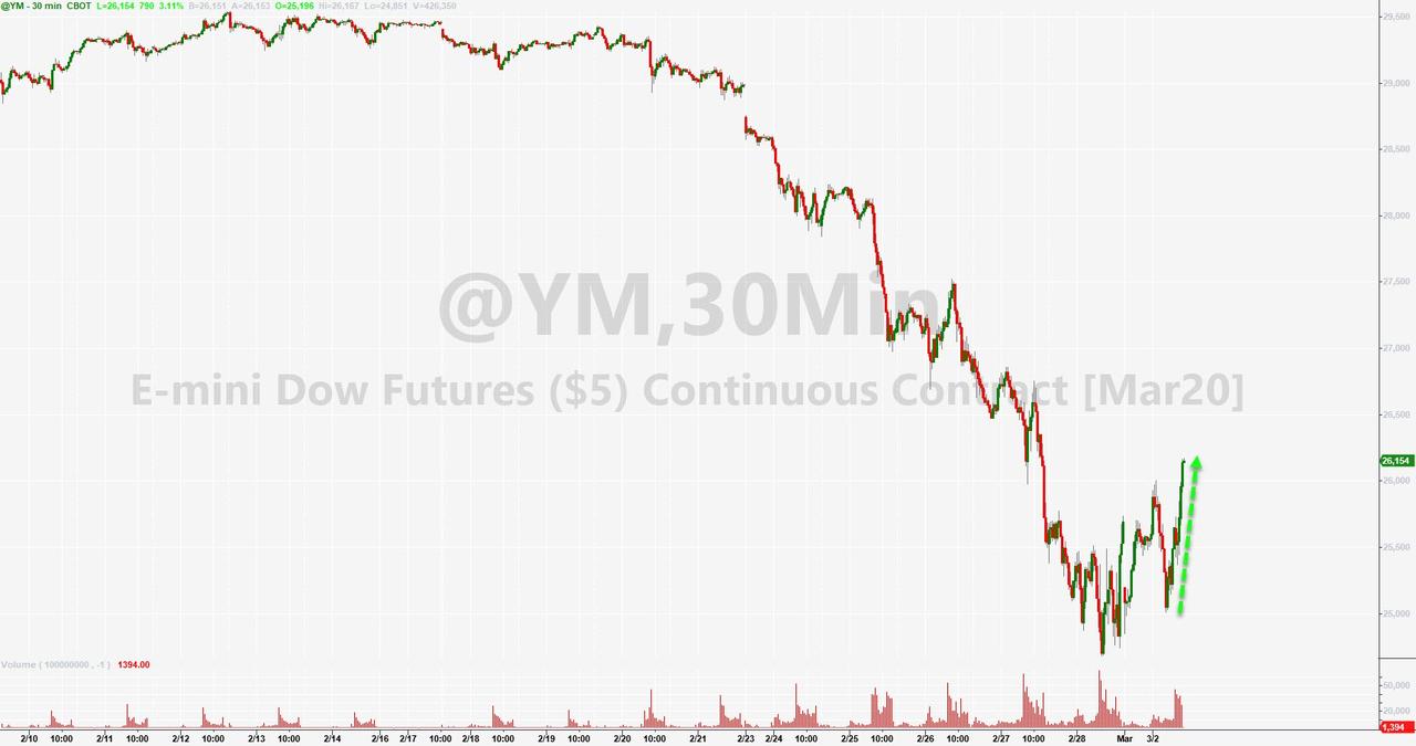 Dow Jumps 1000 Points From Overnight Lows, S&P Tops 3,000, TSY Yields Collapse