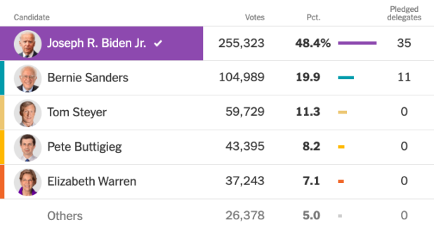 Andrew Anglin Daily Stormer March 1, 2020 12:14 AM With 99% reporting in in South Carolina on Sunday morning, Joe Biden has a staggering 48.4% of the vote, being trailed by Bernie Sanders with a mere 19.9% of the vote. There is a big enough gap between the projections and this win by Biden that […]