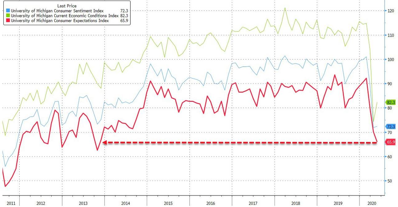 ZeroHedge - May 29th 2020 10:12am EDT UMich Sentiment Disappoints As ‘Hope’ Hits 7-Year Lows Tyler Durden Fri, 05/29/2020 – 10:12 UMich sentiment was expected to have accelerated its rebound from preliminary May data, but it disappointed (despite surging stocks and reopenings). Headline UMich Sentiment up from 71.8 to 72.3 (but down from the 73.7 flash print and below the 74.0 expectations) […]