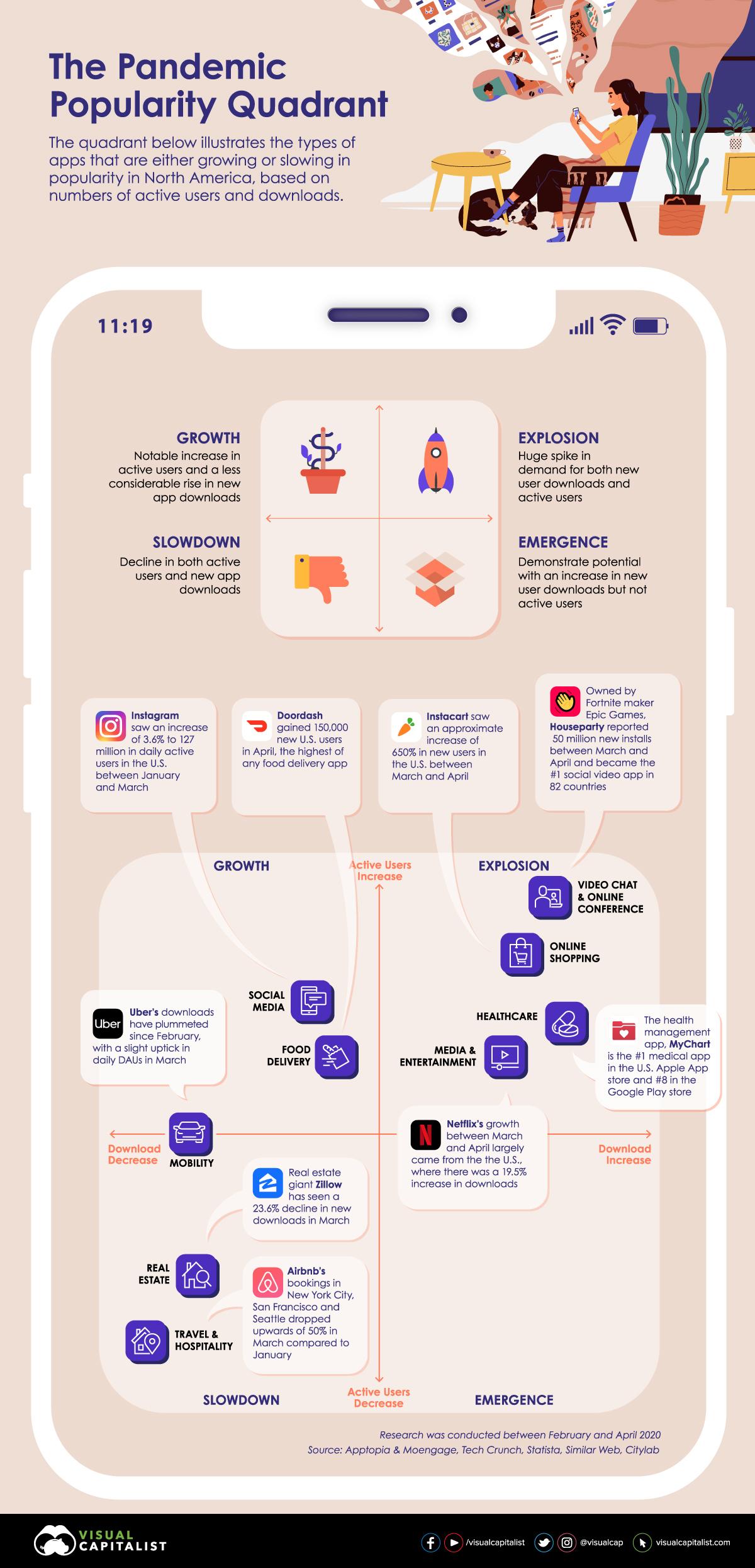 ZeroHedge - May 28th 2020 11:45pm EDT Visualizing The COVID-19 Impact On App Popularity Tyler Durden Thu, 05/28/2020 – 23:45 Pandemic-induced social isolation has altered the relationship consumers have with technology. With the physical world now slowly receding, Visual Capitalist’s Katie Jones notes that consumers are suddenly more reliant on apps for communication, shopping, staying healthy, and entertainment. Today’s graphic pulls data […]