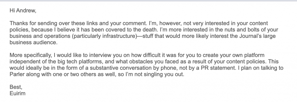 - Jun 30th 2020 3:56pm EDT A former Facebook employee turned Wall Street Journal journalist reached out to me today digging into how Gab runs our business and manages to stay online despite being no-platformed by dozens of service providers over the years. Below is our full email exchange. I want you all to see how these people operate. The way […]