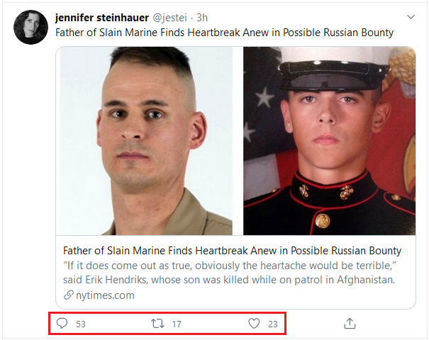 ZeroHedge - Jun 30th 2020 3:50pm EDT Outrage Erupts After NYT Uses Slain Marine’s Photo For “Unsubstantiated” Propaganda Tyler Durden Tue, 06/30/2020 – 15:50 After the Director of National Intelligence and CIA chief Gina Haspel backed the White House’s claim that President Trump was never briefed on unvetted, raw intelligence over an alleged Russian bounty plot against US soldiers, outrage erupted after […]