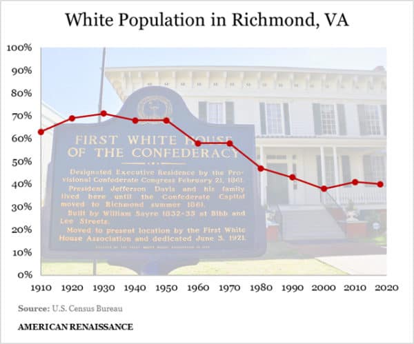 American Renaissance - Jul 31st 2020 8:28pm EDT Until very recently, most Northern cities enjoyed overwhelming white majorities. Southern cities haven’t been so lucky because most blacks stayed in the region until the Great Migration. However, Richmond was a white-majority city until desegregation. Today, blacks and deracinated whites in the city are destroying monuments to Southern resistance, finally consolidating their cultural as well […]