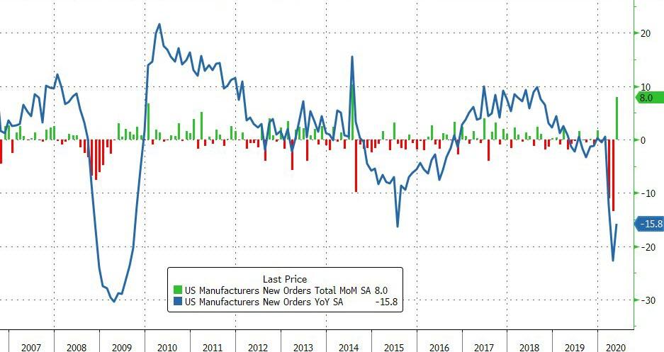ZeroHedge - Jul 2nd 2020 10:05am EDT Rebound In US Factory Orders Disappoints In May Tyler Durden Thu, 07/02/2020 – 10:05 Having collapsed in March and April, US factory orders were expected to surge higher in May as reopenings began. From a 13.0% plunge in April, May’s orders were expected to rebound 8.6% MoM but disappointed, printing +8.0% MoM. This is still […]