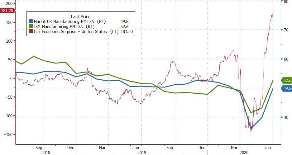 ZeroHedge - Jul 1st 2020 10:05am EDT US Manufacturing Survey Jumps By Record In June (In Contraction & Expansion) Tyler Durden Wed, 07/01/2020 – 10:05 Despite the record surge in the US Macro Surprise Index, May’s rebound in ‘soft’ survey data was much more mixed than many prefer to cherry-pick (PMI rebound much more dramatic than ISM), but flash PMIs suggest June […]