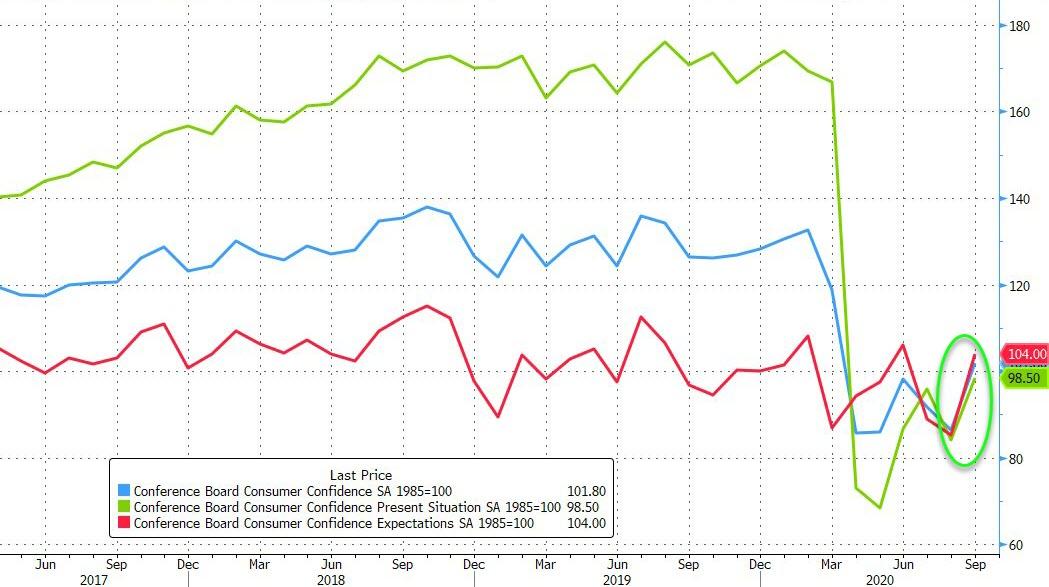 ZeroHedge - Sep 29th 2020 10:07am EDT US Consumer Confidence Jumps Most Since 2003 As Hope Soars Tyler Durden Tue, 09/29/2020 – 10:07 After August’s major disappointment, The Conference Board’s Consumer Confidence for September was expected to rebound from its lowest level since 2014. And rebound it did with the headline confidence print screaming higher from 84.8 to 101.8 (smashing expectations of […]