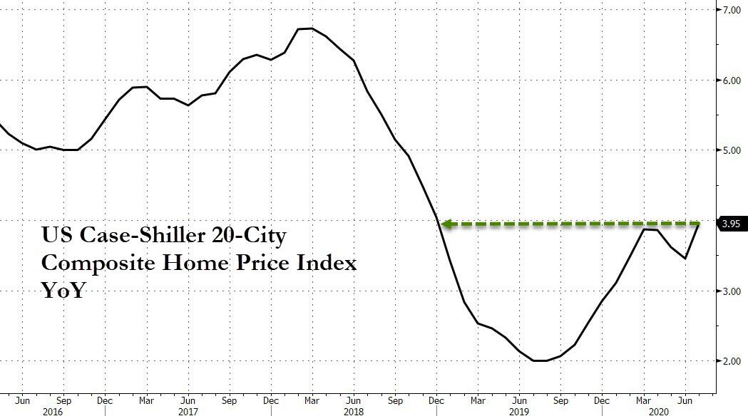 ZeroHedge - Sep 29th 2020 9:04am EDT US Home Prices Surge At Fastest Pace Since 2018 Tyler Durden Tue, 09/29/2020 – 09:04 After three straight months of deceleration, US home prices re-accelerated in July (according to the latest Case-Shiller home price index data), rising 0.55% MoM (vs +0.1% MoM exp). The 20-City Composite index surged 3.95% YoY – the best annual gain […]