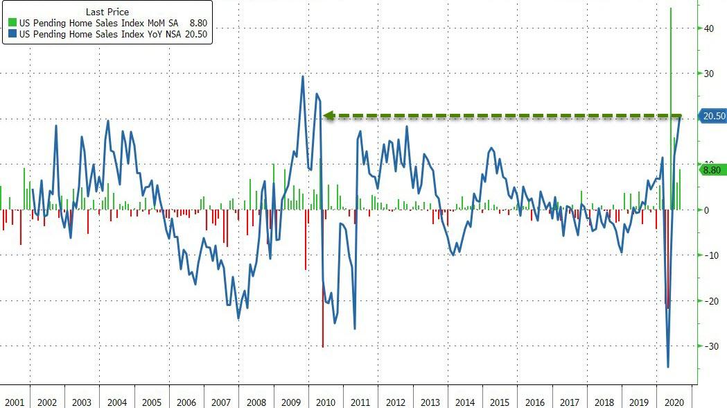 ZeroHedge - Sep 30th 2020 10:10am EDT “Tremendously Low” Rates Send Pending Home Sales Soaring To Record Highs Tyler Durden Wed, 09/30/2020 – 10:10 US Pending Home Sales soared 8.8% MoM (massively better than the 3.1% rise expected and 5.9% rise in July)… Source: Bloomberg This sent the YoY rise in pending home sales to +20.5% – the biggest annual gain since […]