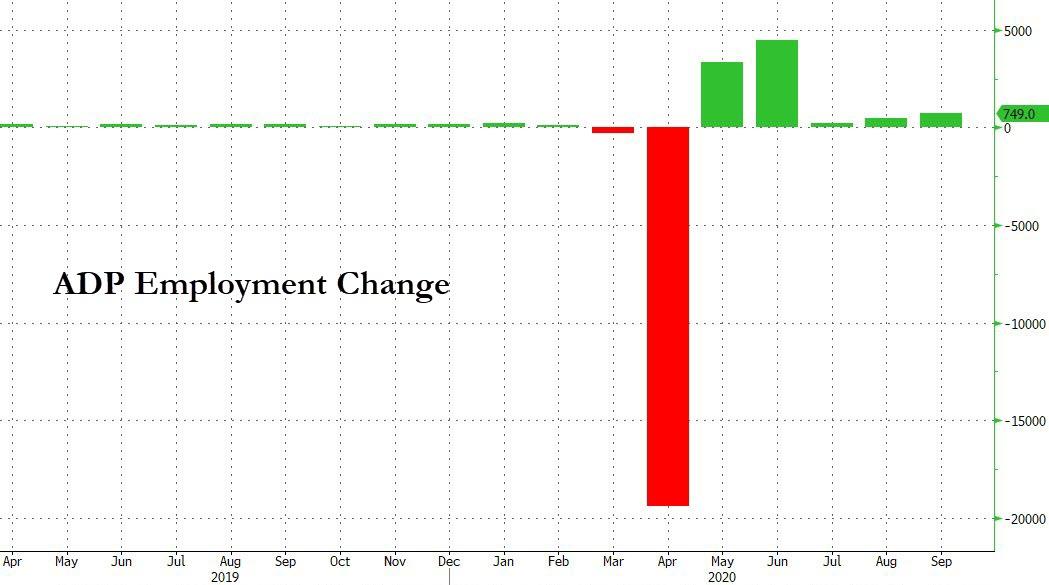 ZeroHedge - Sep 30th 2020 8:22am EDT ADP Employment Beats Expectations Tyler Durden Wed, 09/30/2020 – 08:22 After two month of disappointingly low employment gains, ADP reports a 749,000 increase in jobs in September (better than the 649k expected and close to payrolls 800k expectation for Friday). Source: Bloomberg For some perspective on that ‘rebound’, this is the same level of employment […]