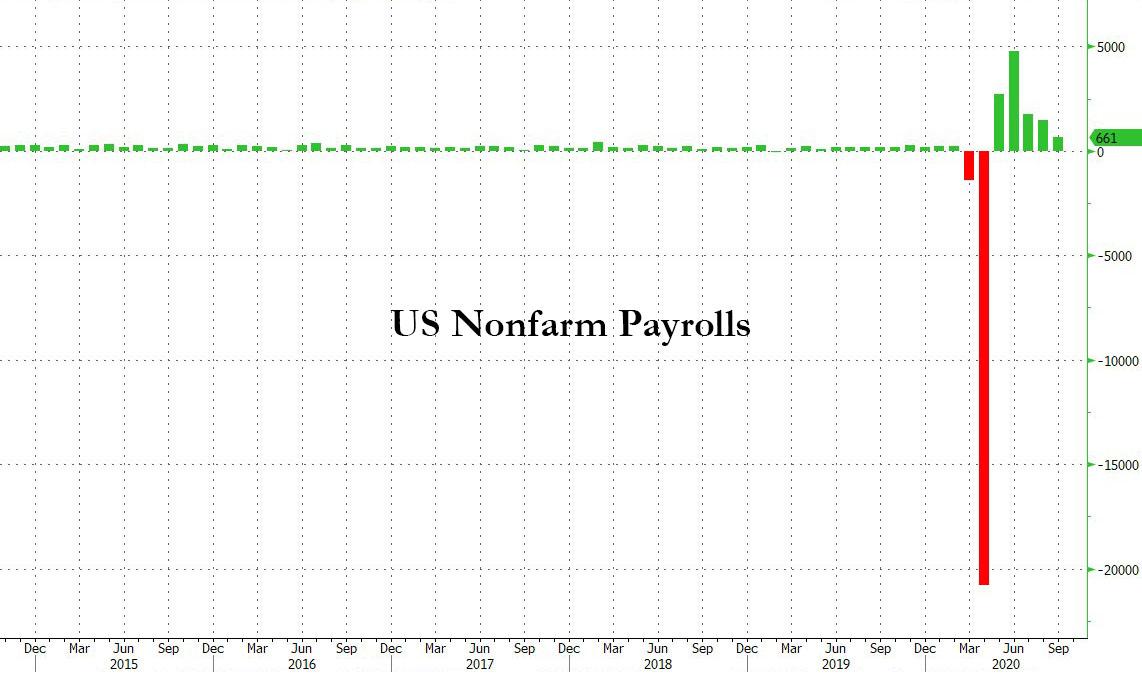 ZeroHedge - Oct 2nd 2020 9:12am EDT US Unemployment Rate Unexpectedly Plunges Below 8% As 661K Jobs Added Tyler Durden Fri, 10/02/2020 – 09:12 In a repeat of last month when the monthly payrolls came in as expected but the unemployment rate dropped far more than expected, moments ago the BLS report that in September a total of 661K jobs were added, […]