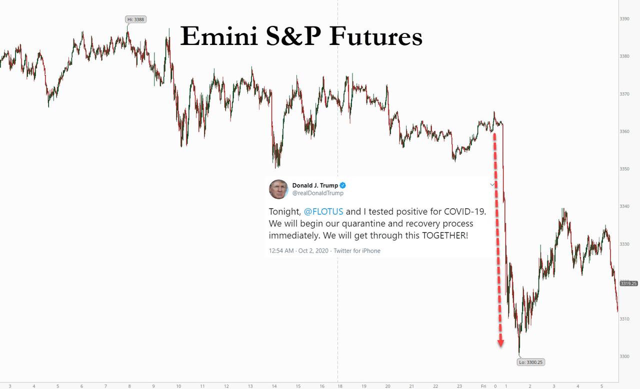 ZeroHedge - Oct 2nd 2020 7:51am EDT “October Shock”: Markets Tumble After Trump Tests Positive For Covid Tyler Durden Fri, 10/02/2020 – 07:51 After going to bed expecting today’s jobs report to be the highlight of the day, shocked traders woke up this morning to the real October shock: the news tweeted by Donald Trump himself at 12:54am ET, that he and […]