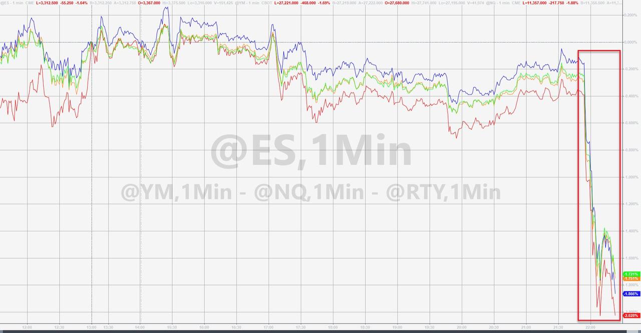 ZeroHedge - Oct 2nd 2020 1:29am EDT Futures Plunge, Gold Spikes After Trump Positive COVID Test Tyler Durden Fri, 10/02/2020 – 01:29 Shortly after headlines hit that President Trump and the First Lady had tested positive for COVID-19, US equity futures plunged… Dow futures are down around 500 points but Small Caps are worst for now… Gold spiked on the news… Treasuries […]
