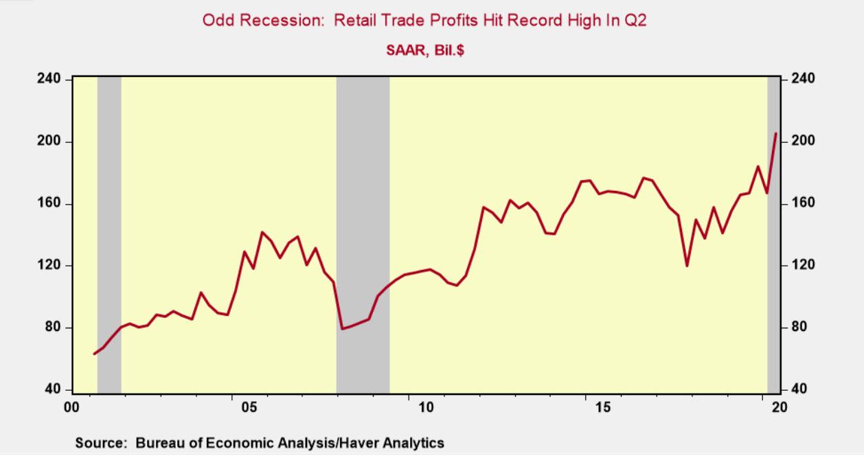 ZeroHedge - Oct 1st 2020 1:11pm EDT Bizarro Recession: Q2 Retail Trade Profits Surge To Record High Tyler Durden Thu, 10/01/2020 – 13:11 As Joseph Carson, former chief economist of AllianceBernstein, writes every recession has unique features, but this is one for the record books (no pun intended). According to the GDP report released on Wednesday, operating profits for the retail trade […]