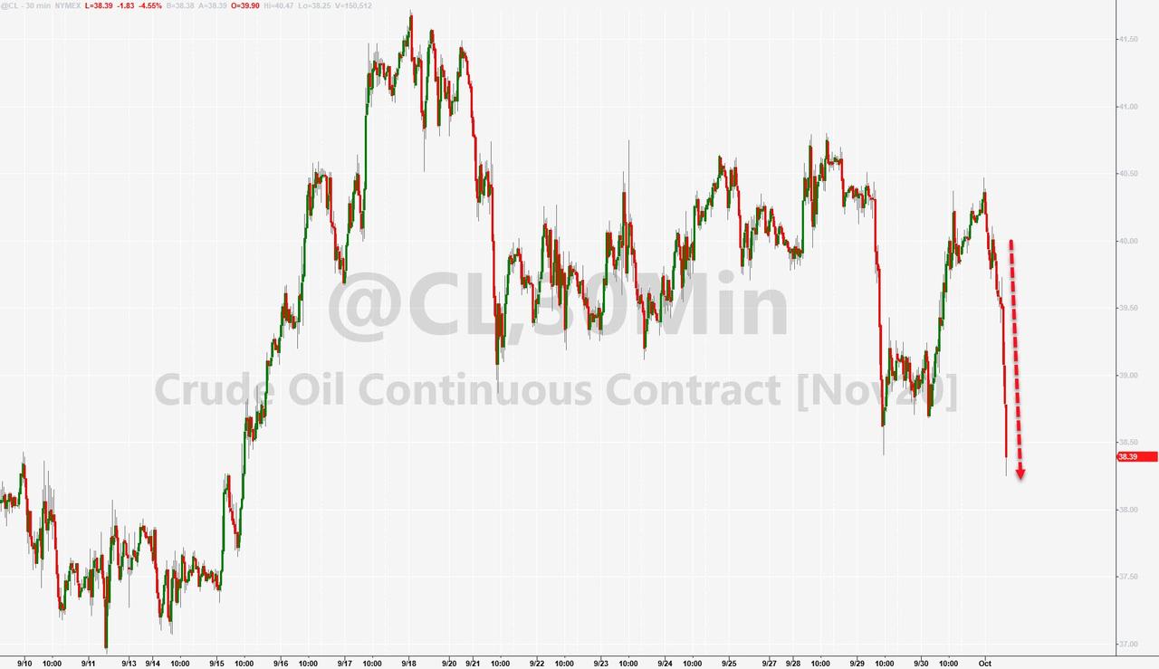 ZeroHedge - Oct 1st 2020 10:11am EDT Copper & Crude Crashing As Growth Fears Re-Emerge Tyler Durden Thu, 10/01/2020 – 10:11 Headlines signaling dwindling chance of new fiscal stimulus combined with notable disappointments in US manufacturing data has sent the ‘growth-signaling’ commodities crashing… Crude is collapsing, back below $39… But it’s not just US, as COVID continues to re-emerge worldwide in its […]
