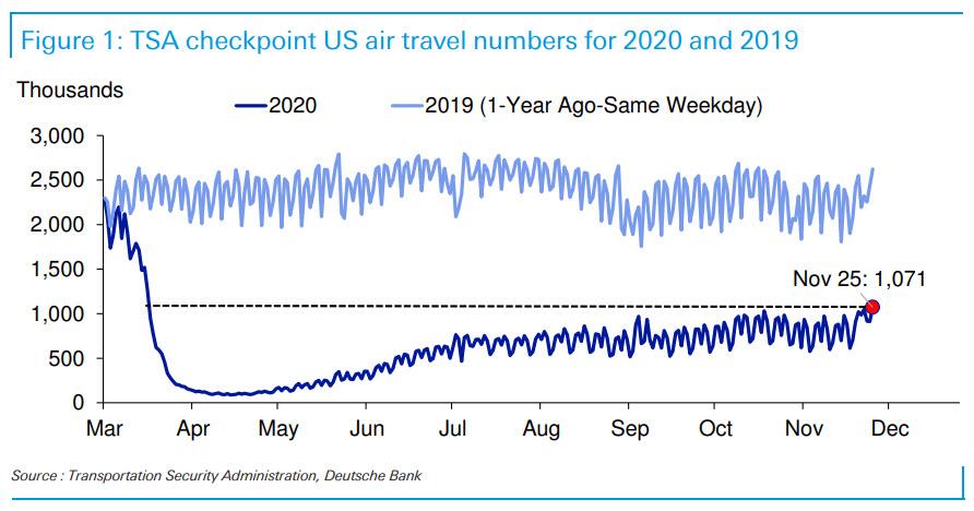 ZeroHedge - Nov 27th 2020 5:14pm EST Was Wednesday A Super Spreader Event, One Bank Asks Tyler Durden Fri, 11/27/2020 – 17:14 From DB’s Jim Reid Wednesday was the busiest day at US airports since the pandemic began. The Transportation Security Administration screened more than 1.07 million people at US airports on Thanksgiving eve. For context this number was still down 41% […]