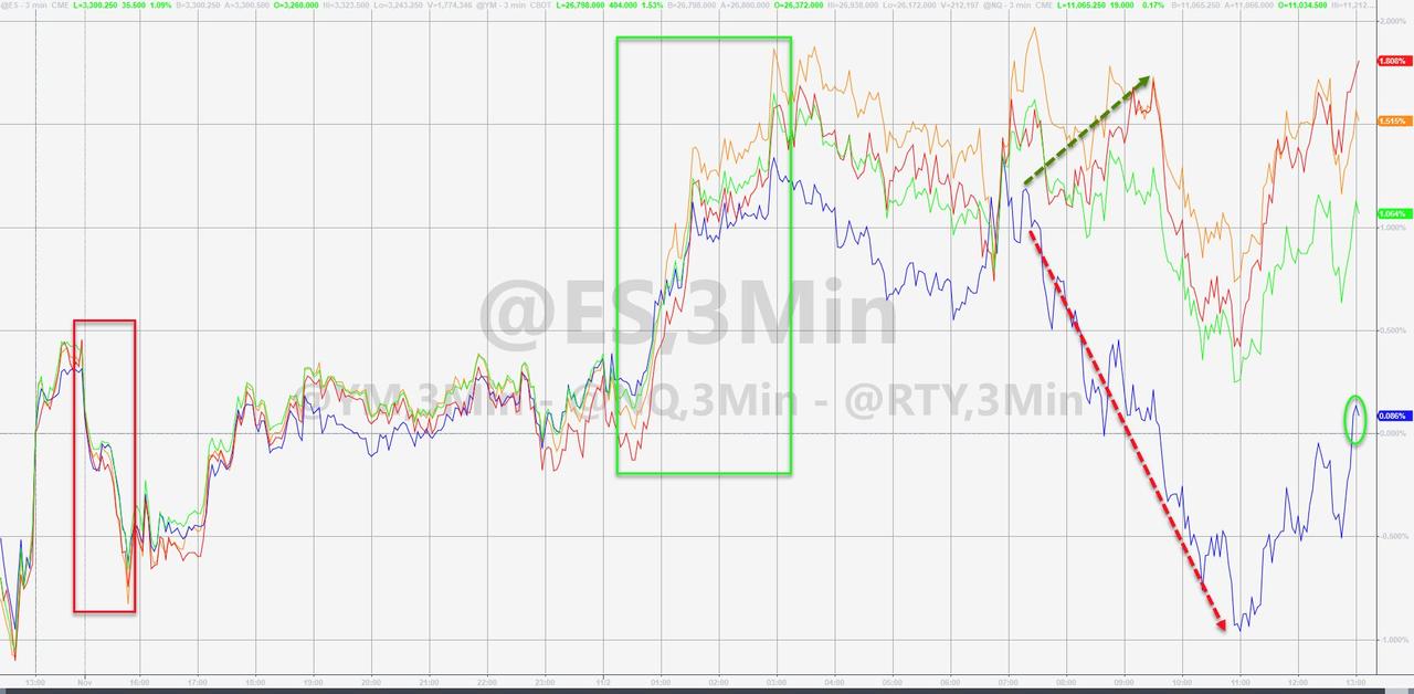 ZeroHedge - Nov 2nd 2020 4:01pm EST Despite Tech Tumble; Stocks, Bonds, Gold, & The Dollar Rally On Election Eve Tyler Durden Mon, 11/02/2020 – 16:01 As Asia closed and Europe opened, US equity futures were panic bid up 400-plus Dow points overnight, clung to gains into the US cash open when Nasdaq was dumped and Small Caps pumped along with The […]