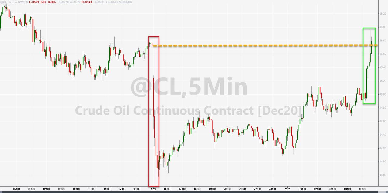 ZeroHedge - Nov 2nd 2020 8:42am EST Oil Surges On Report Russia Proposes Delay Of OPEC+ Output Hike Tyler Durden Mon, 11/02/2020 – 08:42 After plunging late on Sunday as electronic trading returned after a week in which the UK announced fresh lockdowns while Libyan output surged to 1mmb/d, oil has followed in futures’ footsteps and moments ago reversed dramatically, and turned […]