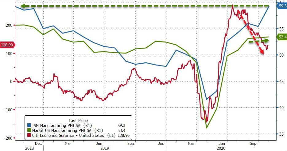 ZeroHedge - Nov 2nd 2020 10:06am EST US Manufacturing Surveys Soar In October To 2-Year Highs Tyler Durden Mon, 11/02/2020 – 10:06 Following Europe’s continued Manufacturing PMI rebound, US manufacturing was expected to have stabilized at September’s levels through October. October US Manufacturing ISM BEAT 59.3 – vs 56.0 exp vs 55.4 prior October US Manufacturing PMI BEAT – 53.4 vs 53.3 […]