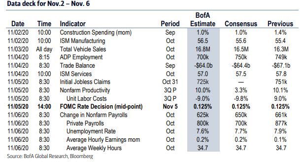 ZeroHedge - Nov 2nd 2020 9:17am EST Key Events In The Coming “Huge Week” For Global Markets Tyler Durden Mon, 11/02/2020 – 09:17 The coming week will be the busiest and most important 5 days of the year, if not decade. It is a “huge week” for investors with the election, a Fed decision, 128 S&P earnings, October payrolls, ongoing pandemic lockdowns […]