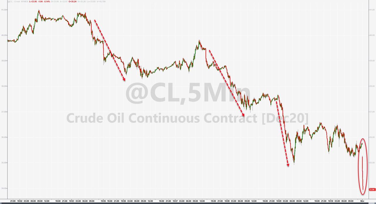 ZeroHedge - Nov 1st 2020 6:25pm EST Crude Crashes In Early Asia Trading Tyler Durden Sun, 11/01/2020 – 18:25 WTI just tumbled to a $33 handle in early trading (after being above $40 just 3 days ago) as demand fears (European lockdowns) and supply concerns (Libya ramped up its production) combined to spark anxiety about the energy complex outlook. Dec WTI Futs […]