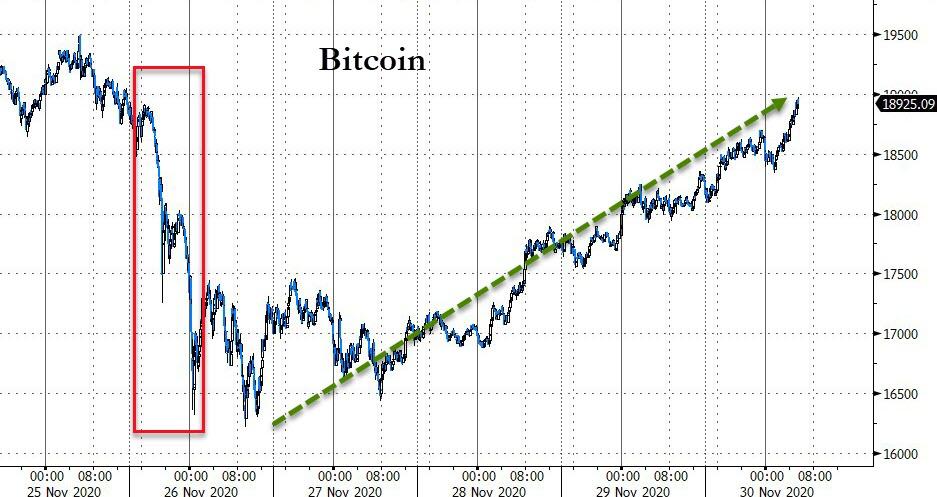 Bitcoin Tops $19k, Bounces Back From Black Friday FUD Fall Tyler Durden Mon, 11/30/2020 – 08:41 Bitcoin’s recent tumble cleared some speculative “froth” but further declines remain possible, according to JPMorgan, and that appears to have been confirmed as Bitcoin roars back to $19,000 this morning… Momentum traders such as commodity trading advisors and other quantitative funds […]