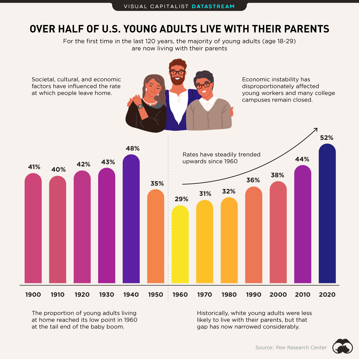 ZeroHedge - Nov 29th 2020 3:45pm EST Over Half Young American Adults Now Live With Their Parents Tyler Durden Sun, 11/29/2020 – 15:45 In the last few decades, young adults have faced harsh economic realities – from the financial crisis in 2008 to this year’s global pandemic, both triggering catastrophic losses in jobs and financial stability. And while the widespread effects of […]