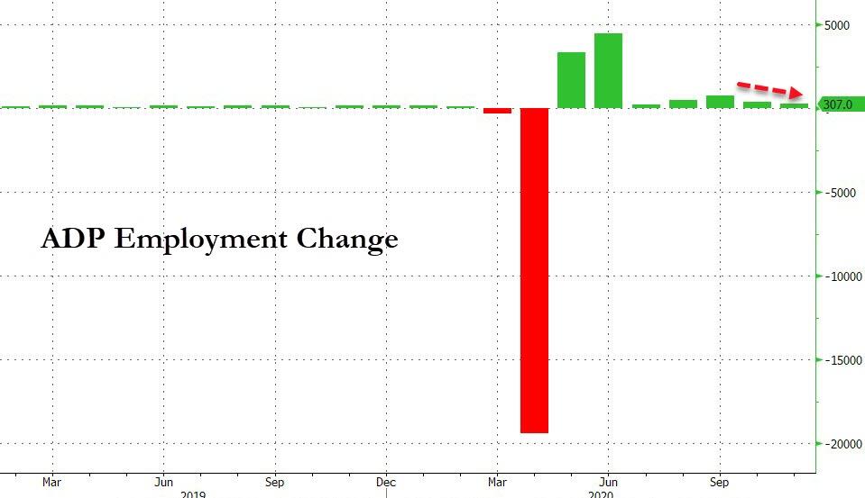 ZeroHedge - Dec 2nd 2020 8:21am EST Big Miss On ADP Employment Suggests Labor Market Weakness Accelerating Tyler Durden Wed, 12/02/2020 – 08:21 Amid a second wave of lockdowns, weak ISM employment data, and a disappointing rebound in initial jobless claims, analysts expected ADP employment data to hold steady with a gain of 440k in November (after disappointing expectations in October). However, […]
