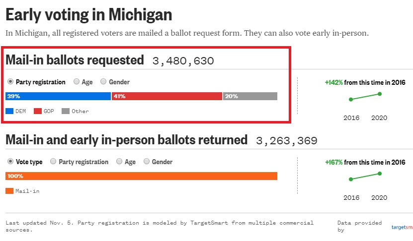 Statisticians concur: Tabulating equipment was programmed to shift a percentage of absentee votes from Trump to Biden in every Michigan precinct