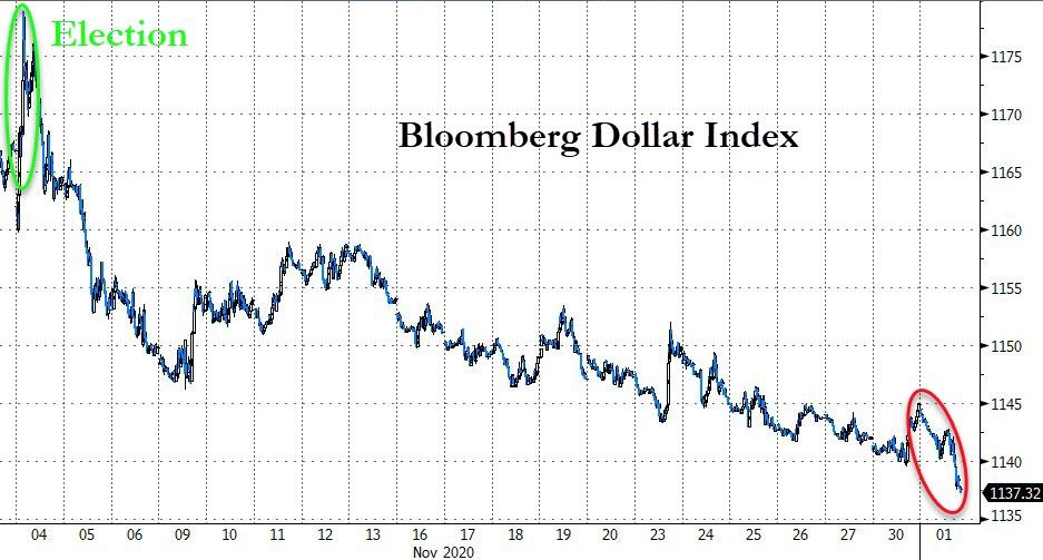 ZeroHedge - Dec 1st 2020 3:49pm EST Gold, Stocks, & Bond Yields Surge As Dollar Purge Continues Tyler Durden Tue, 12/01/2020 – 16:00 Since the election, and the ongoing roll out of Biden’s nominees for economic and policy teams, the dollar has been on a one-way streak lower… Source: Bloomberg The dollar is unchanged versus its fiat peers since Jan 2015… Source: […]