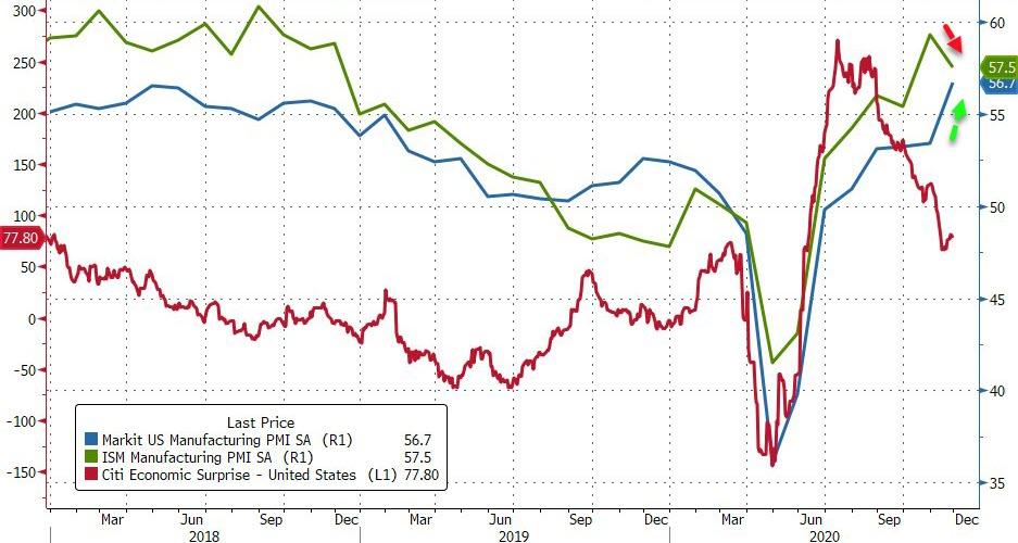 ZeroHedge - Dec 1st 2020 10:04am EST US Manufacturing Surveys Send Mixed Signals As Employment Plunges Tyler Durden Tue, 12/01/2020 – 10:04 China’s overnight exuberance in its PMI surveys buoyed global stock markets but all eyes will be on US data this morning. As US ‘hard’ data has slumped for 4 straight months, ‘soft’ survey data has continued to surprise to the […]