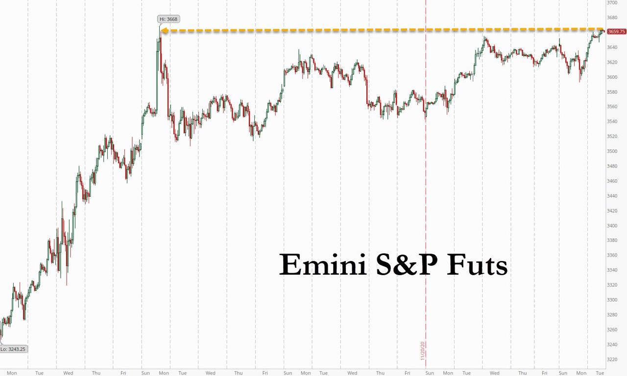 ZeroHedge - Dec 1st 2020 7:54am EST Futures Soar Just Shy Of Record Highs As Meltup Returns Ahead Of Powell Hearing Tyler Durden Tue, 12/01/2020 – 07:54 S&P futures and global stocks started the last month of the year on a euphoric note, rallying to just below all time highs following a freak one-day selloff (perhaps on pension-rebalance selling) to close November […]