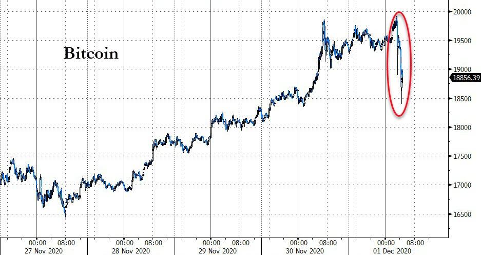ZeroHedge - Dec 1st 2020 8:02am EST Gold Jumps Back Above $1800 As Bitcoin Drops $2000 From Record High Tyler Durden Tue, 12/01/2020 – 08:02 After testing new record highs overnight, just shy of $20,000, Bitcoin has tumbled $2000 this morning… Source: Bloomberg The entire crypto space is also getting whacked… Source: Bloomberg And at the same time, gold has surged back […]