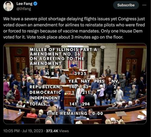 Congressional Uniparty Votes Down Amendment For Airlines To Reinstate Pilots That Rejected “Vaccine”