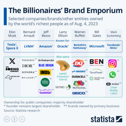 ZeroHedge - Aug 9th 2023 4:15am EDT The Billionaires’ Brand Emporium The people who have built some of the world’s most successful and influential companies have earned the extra cash that has enabled them to found and acquire – more companies and brands. However, as Statista’s Katharina Buchholz explains below, the world’s richest billionaires, including Elon Musk, Bernard Arnault, Jeff Bezos and […]