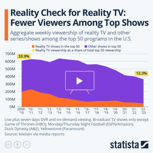 ZeroHedge - Sep 28th 2023 10:00pm EDT Reality Check For Reality TV: Fewer Viewers Among Top Programs Its chaos, cringe factor and supposed authenticity made reality TV part of the collective identity of television audiences all over the world when it started out in the 1990s. The genre treading fine lines between scripted and unscripted TV, fandom and voyeurism as well as sincere emotion […]