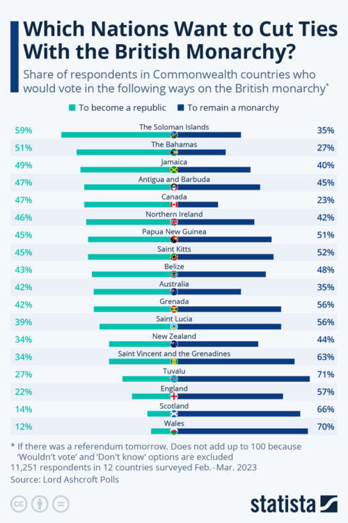 ZeroHedge - Sep 27th 2023 4:15am EDT Which Nations Want To Cut Ties With The British Monarchy? Jamaica may be the next country to sever ties with the British monarchy, with a referendum in the island nation on whether to remove King Charles as their head of state set for 2024. And, as Statista’s Anna Fleck details below, it’s not the only […]