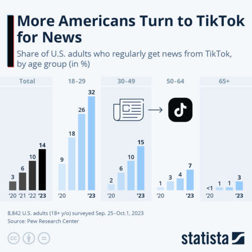 ZeroHedge - Mar 18th 2024 8:40pm EDT More & More Americans Turn To TikTok For News The House of Representatives passed a bill last week that could lead to a nationwide ban of the social media platform TikTok in the United States, unless its Chinese owner Byte Dance sells its stake in the company within 165 days. U.S. lawmakers had raised concerns […]