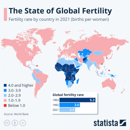 ZeroHedge - Mar 1st 2024 11:20pm EST The State Of Global Fertility South Korea broke its own record when it announced this week that as of 2023, its fertility rate had fallen to just 0.72 births per woman. The rate at which a population replaces itself between generations without migration stands at around 2.1. As Statista’s Katharina Buchholz reports, the following map with comparable data between […]