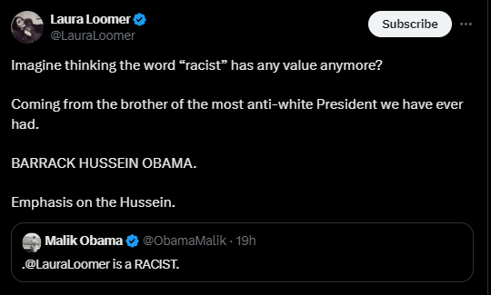 Laura Loomer - Mar 1st 2024 12:21pm EST Malik Obama, the older half-brother of Barack Obama, called Laura Loomer racist over a Loomer Unleashed video taken on Thursday showing Ilhan Omar’s hypocrisy of calling supporters of President Trump “extremists.” Omar’s congressional colleagues have credibly accused her of sharing pro-Hamas propaganda in the halls of Congress. In the video, Omar called the Loomer Unleashed […]