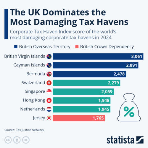 ZeroHedge - Oct 2nd 2024 5:45am EDT Is The UK The ‘Biggest Enabler’ Of Corporate Tax-Dodging? New analysis by the Tax Justice Network has revealed the United Kingdom to be the biggest enabler of corporate tax dodging in the world. As Statista’s Anna Fleck shows in the infographic below, British Overseas Territories and Crown Dependencies dominate the top eight roundup of places allowing multinationals to avoid […]