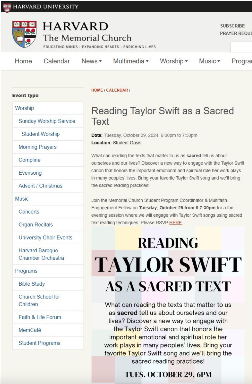 Dr. Peter McCullough MD - Oct 31st 2024 12:20pm EDT I just saw the following announcement for a lecture that was held a couple of days ago in Harvard’s Memorial Church. Reviewing the lyrics of some of Swift’s popular songs, I see that most are unhappy odes to boys with whom it didn’t work out. For example: From: “Cold as You” And you come away […]
