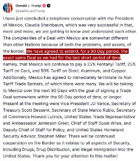 JUST IN – Trump grants Mexico 90-day extension to reach trade deal, temporary tariffs remain in place. https://truthsoc…