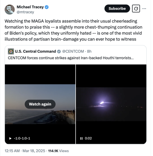 David Icke - Mar 18th 2025 2:04am EDT It took Trump *checks notes* less than two months to go from promising “No new wars,” to bombing Yemen and killing dozens of civilians, including several children, and openly threatening war against Iran… pic.twitter.com/1tgeFDwUMu — Rachel Blevins (@RachBlevins) March 17, 2025