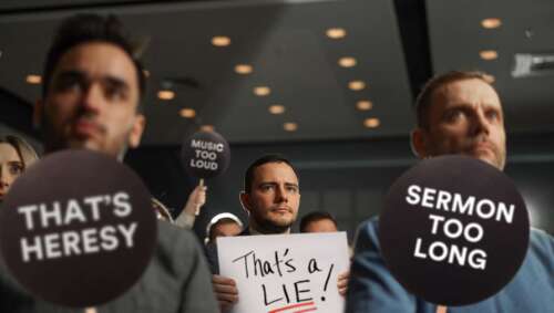 Disgruntled Churchgoers Hold Up Protest Paddles (Satire)