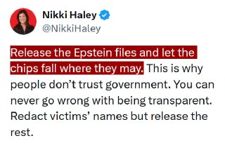 NEW - Nikki Haley calls for Trump to "release the Epstein files and let the chips fall where they may." https://x.com/N...