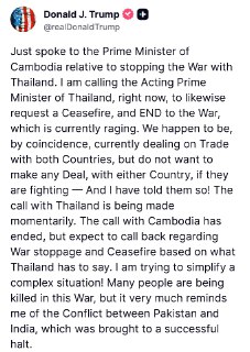 JUST IN - Trump speaks to Cambodia's PM, calls for a ceasefire and "END to the war" says that U.S. won't make a trade de...