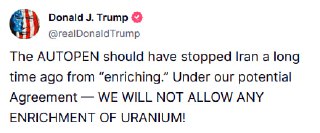 JUST IN - Trump on Iran: "WE WILL NOT ALLOW ANY ENRICHMENT OF URANIUM!" https://truthsocial.com/ realDonaldTrump/114616...
