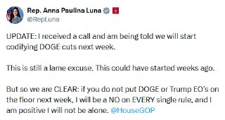 JUST IN – The House’s codification of DOGE cuts is now delayed until next week, Rep. Luna says. @disclosetv