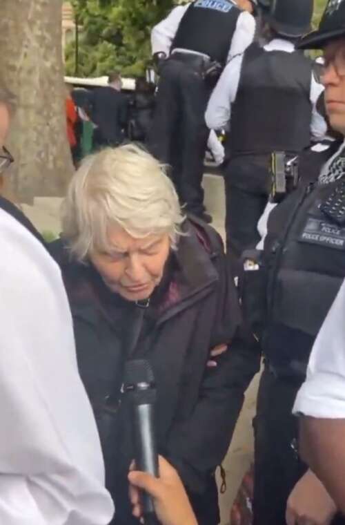 Palestine Action is just being proscribed in UK . The British Gestapo police have arrested an 83 year old priest for holding a sign saying she supports Palestine Action. pic.twitter.com/tS0oXgZ9hu — Irlandarra (@aldamu_jo) July 5, 2025